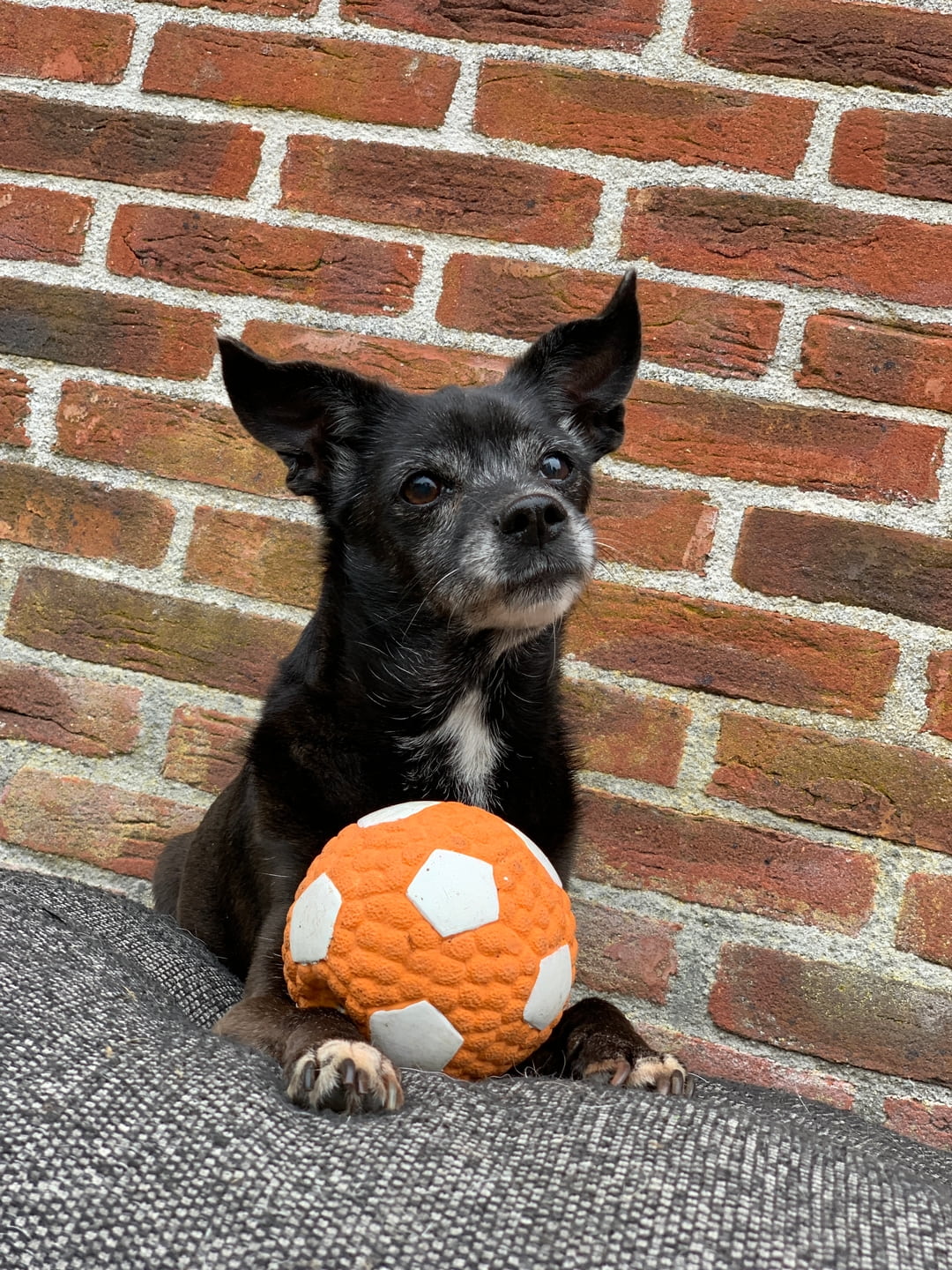 Twee maanden lang genoten jij en baasje Fred van elkaar. Tot je baasje heel plots onverwacht in jouw bijzijn overleed. Je moet gehuild, gejankt en geroepen hebben om hulp, maar niemand die je hoorde. Het was warm en er kwam noodweer maar niemand die zich om jou bekommerde. De volgende dag was je 12e verjaardag. Geen lekkers, geen wandelingen, geen aandacht, maar eenzaamheid en geen eten en drinken. Een dag later ontdekte een bezoeker dat je baasje was overleden en je werd direct naar het asiel gebracht. Weer zat je eenzaam in een kennel. Pas een dag later kwam je ook nog via omwegen hier terug in de opvang. Wat was je blij me te zien! Maar logisch liet je me niet meer uit het oog. Je raakte al overstuur als er een hek tussen ons zat. Hoewel ik je graag zag was het toch echt beter voor jou om baasjes te krijgen waar het zo geregeld kan worden dat je zelden alleen hoeft te zijn. Gelukkig hebben we deze baasjes gevonden. Je bent zo welkom bij hen!